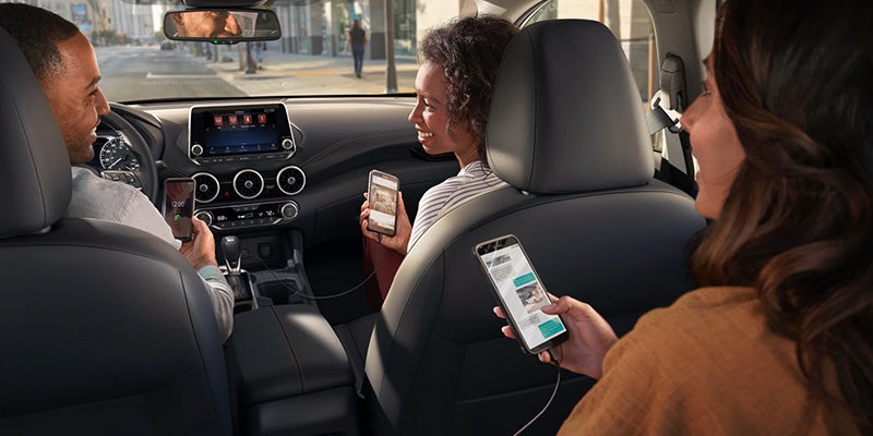 Inside the 2022 Nissan Sentra, you'll find Zero Gravity front seats, a heated steering wheel, dual zone automatic temperature control, heated front seats, and a slick push button ignition. You'll also have plenty of space for luggage with an easy-load trunk that contains 14.3 cubic feet of cargo space. The car also includes a wide range of the latest technology, including a 4.2-inch driver display and a seven-inch interactive touchscreen display. There are four speakers, a USB A connector, and rear door alert. The SV and SR trim levels expand the number and variety of USB connection options.