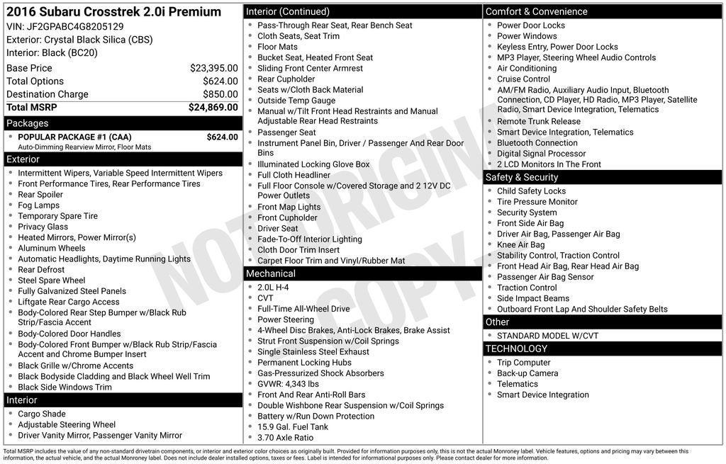 This 2016 Subaru Crosstrek 2.0i Premium is an exceptional value, blending rugged capability, advanced technology, and premium comfort features. With its low mileage and comprehensive package of upgrades, this Crosstrek is poised to be your trusted companion for years to come. Schedule a test drive today and experience the difference for yourself.