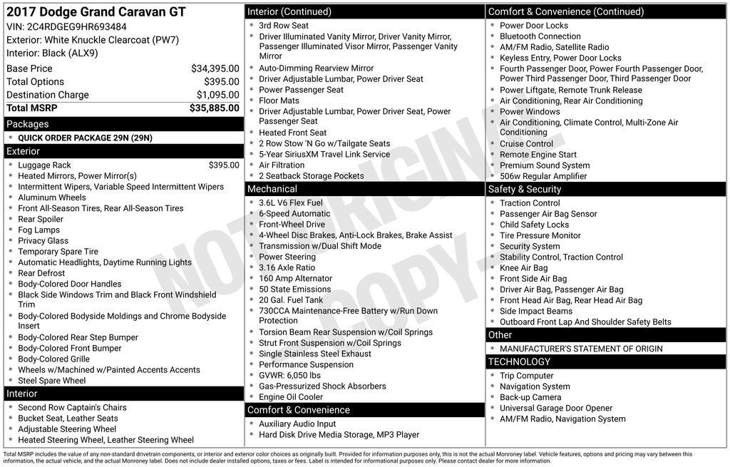115V Auxiliary Power Outlet, 17 x 6.5 Aluminum Wheels, 2 Row Stow 'N Go w/Tailgate Seats, 2nd Row Buckets w/Fold-In-Floor, 3.16 Axle Ratio, 3rd row seats: split-bench, 4-Wheel Disc Brakes, 40GB Hard Drive w/28GB Available, 5-Year SiriusXM Travel Link Service, 6.5 Touchscreen Display, 9 Speakers, ABS brakes, Air Conditioning, Alloy wheels, AM/FM radio: SiriusXM, Anti-whiplash front head restraints, Audio Jack Input for Mobile Devices, Auto-dimming Rear-View mirror, Automatic temperature control, Black Side Roof Rails, Bodyside moldings, Brake assist, Bumpers: body-color, CD player, Compass, Delay-off headlights, Driver door bin, Driver vanity mirror, Driver's Seat Mounted Armrest, Dual front impact airbags, Dual front side impact airbags, DVD-Audio, Electronic Stability Control, Front anti-roll bar, Front Bucket Seats, Front dual zone A/C, Front fog lights, Front reading lights, Front wheel independent suspension, Fully automatic headlights, Garage door transmitter, Garmin Navigation System, Heated door mirrors, Heated front seats, Heated rear seats, Heated steering wheel, Illuminated entry, Integrated Roof Rail Crossbars, Knee airbag, Leather Shift Knob, Leather Trimmed Bucket Seats, Low tire pressure warning, Manufacturer's Statement of Origin, Navigation system: Garmin, Occupant sensing airbag, Outside temperature display, Overhead airbag, Overhead console, Panic alarm, ParkView Rear Back-Up Camera, Passenger door bin, Passenger seat mounted armrest, Passenger vanity mirror, Performance Suspension, Power door mirrors, Power driver seat, Power Liftgate, Power passenger seat, Power steering, Power windows, Quick Order Package 29N, Radio data system, Radio: 430 Nav, Radio: 430 Nav (DISC), Rear air conditioning, Rear reading lights, Rear window defroster, Rear window wiper, Reclining 3rd row seat, Remote keyless entry, Security system, SiriusXM Travel Link, Speed control, Split folding rear seat, Spoiler, Steering wheel mounted audio controls, Tachometer, Telescoping steering wheel, Tilt steering wheel, Traction control, Trip computer, Variably intermittent wipers. 2017 Dodge Grand Caravan