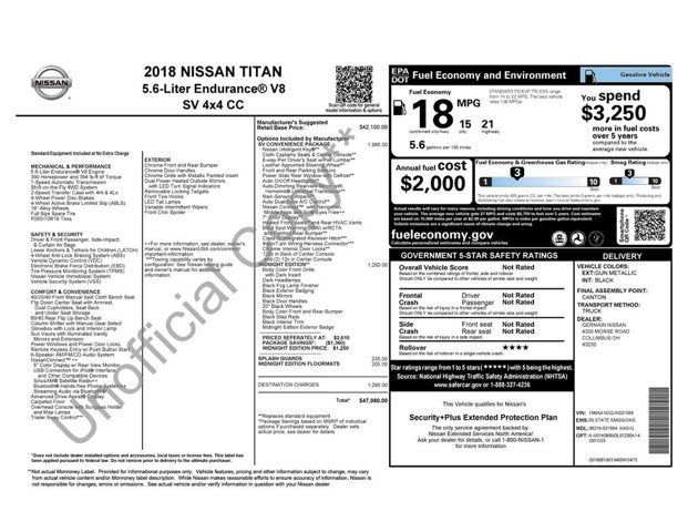 2.937 Axle Ratio, 4-Pin/7-Pin Wiring Harness Connector (Rear Bumper), 4-Wheel Disc Brakes, 6 Speakers, ABS brakes, Air Conditioning, Alloy wheels, AM/FM radio: SiriusXM, Auto-Dimming Rear-View Mirror, Automatic On/Off Headlights, Black Exterior Badging, Black Fog Lamp Finisher, Black Mirrors & Door Handles, Black Step Rails, Blind Spot Warning w/Rear Cross Traffic Alert, Body Color Front & Rear Bumpers, Body Color Front Grille w/Dark Insert, Brake assist, Bumpers: chrome, CD player, Charcoal Interior Trim, Chrome Interior Door Locks, Cloth Seat Trim, Convex Spotter Mirror, Dark Headlamps, Driver door bin, Driver vanity mirror, Dual front impact airbags, Dual front side impact airbags, Dual Zone Automatic HVAC, Electronic Stability Control, Front & Rear Parking Sensors, Front anti-roll bar, Front Center Armrest w/Storage, Front Manual Split Bench Seat (40/20/40), Front reading lights, Front wheel independent suspension, Heated door mirrors, Heated Front Captain's Chairs, Illuminated entry, Intelligent Key System, Leather Seat Trim, Leather-Wrapped Steering Wheel, Low tire pressure warning, Midnight Edition, Occupant sensing airbag, Outside temperature display, Overhead airbag, Overhead console, Painted Rear Bumper, Panic alarm, Passenger door bin, Passenger vanity mirror, Power door mirrors, Power Sliding Rear Window w/Defogger, Power steering, Power windows, Radio data system, Radio: Nissan Navigation System w/Voice Guidance, Radio: NissanConnect AM/FM w/SiriusXM, Rain Sensing Wipers, Rear Air Conditioning Vents, Rear anti-roll bar, Rear seat center armrest, Rear step bumper, Rear window defroster, Receiver Hitch, Remote keyless entry, Security system, Siri Eyes Free, Speed control, Speed-sensing steering, Speed-Sensitive Wipers, Splash Guards, Split folding rear seat, Steering wheel mounted audio controls, SV Convenience Package, Tachometer, Telescoping steering wheel, Tilt steering wheel, Traction control, Trip computer, Turn signal indicator mirrors, Universal Garage Door Opener, Variably intermittent wipers, Voltmeter, Wheels: 18 x 8 Silver Painted Alloy. 2018 Nissan Titan Clean CARFAX.