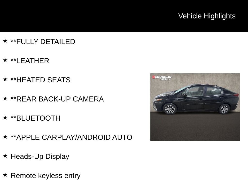 This 2021 Toyota Prius Prime Limited is a remarkable hybrid vehicle that offers exceptional fuel efficiency, advanced technology, and a refined driving experience. With its sleek black exterior and an impressive array of premium features, this Prius Prime is the perfect choice for the eco-conscious driver seeking a sophisticated and practical transportation solution.