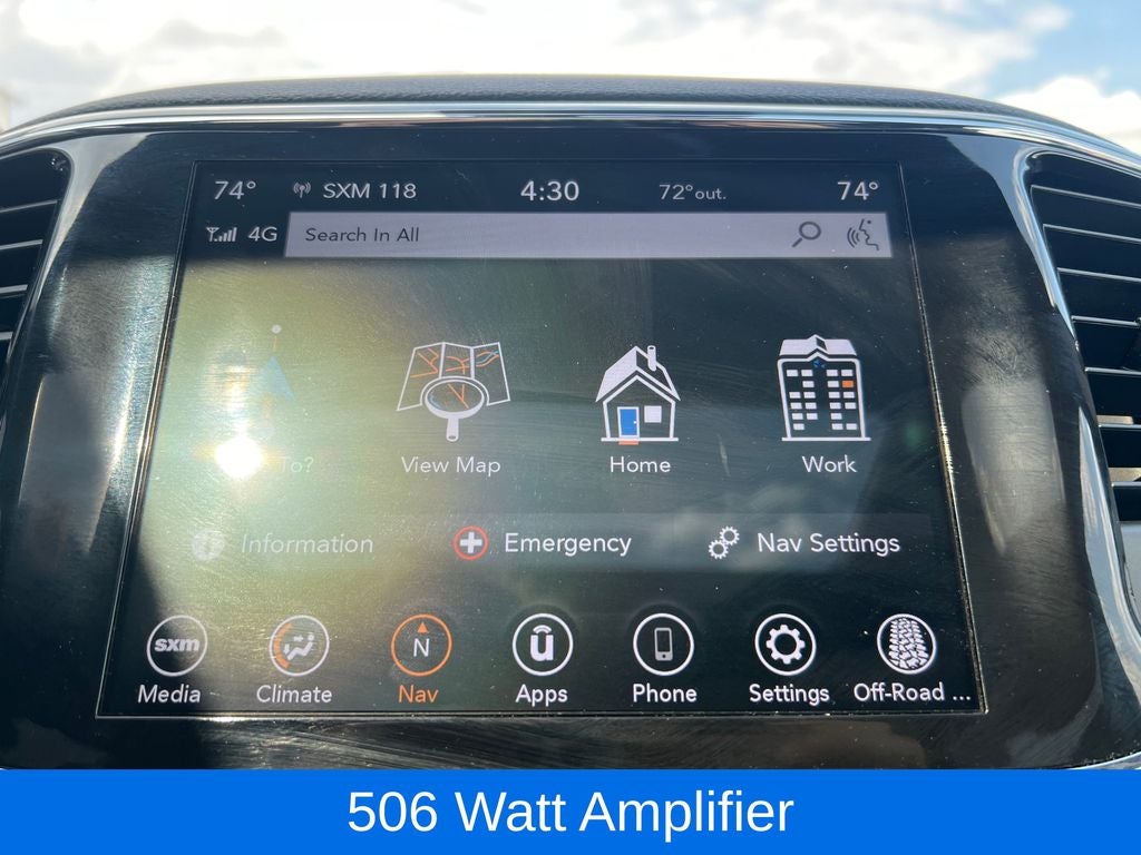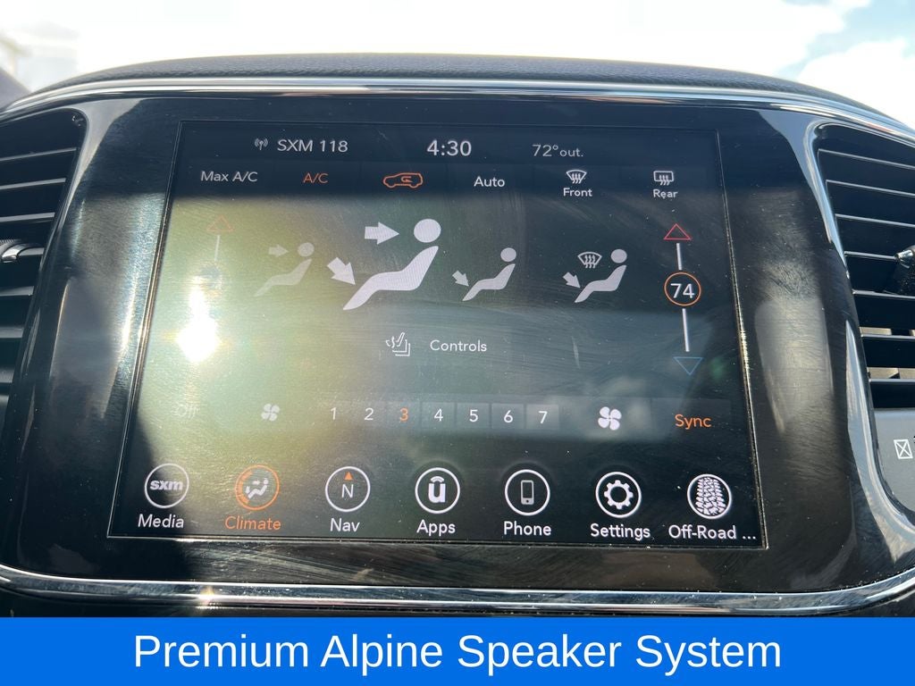 Step inside the cabin and you'll be greeted by a wealth of premium amenities, including a large 8.4-inch Uconnect touchscreen display, a premium Alpine speaker system, and a power liftgate for easy access to the spacious cargo area. The heated front seats and leather-wrapped steering wheel add an extra touch of luxury, while the available power moonroof allows you to enjoy the great outdoors.