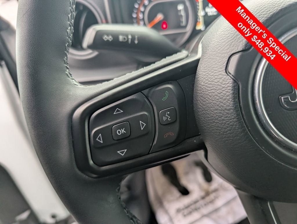 4-Wheel Disc Brakes, 4.10 Rear Axle Ratio, 4G LTE Wi-Fi Hot Spot, 8 Speakers, 97 MPH Vehicle Max Speed Calibration, ABS brakes, Air Conditioning, Alloy wheels, AM/FM radio: SiriusXM, Apple CarPlay, Apple CarPlay/Android Auto, Automatic temperature control, Aux Battery, Auxiliary Switches, Brake assist, Class II Receiver Hitch, Cloth Low-Back Bucket Seats, Compass, Connectivity - US/Canada, Convenience Group, Delay-off headlights, Driver door bin, Driver vanity mirror, Dual front impact airbags, Dual front side impact airbags, Electronic Stability Control, Emergency communication system: Jeep Connect, Front anti-roll bar, Front Bucket Seats, Front Center Armrest w/Storage, Front dual zone A/C, Front fog lights, Front License Plate Bracket (DISC), Front reading lights, Fully automatic headlights, Google Android Auto, Heated door mirrors, Heated Front Seats, Heated Steering Wheel, Illuminated entry, Integrated roll-over protection, Low tire pressure warning, Non-Lock Fuel Cap w/o Discriminator, Occupant sensing airbag, Outside temperature display, Overhead airbag, Panic alarm, ParkView Rear Back-Up Camera, Passenger door bin, Passenger vanity mirror, Performance Suspension, Power door mirrors, Power steering, Power windows, Quick Order Package 24R Rubicon, Radio data system, Radio: Uconnect 5 w/12.3 Display, Rear anti-roll bar, Rear reading lights, Remote keyless entry, Security system, Speed control, Split folding rear seat, Steering wheel mounted audio controls, Stop-Start Dual Battery System, Tachometer, Telescoping steering wheel, Tilt steering wheel, Traction control, Trip computer, Universal Garage Door Opener, Variably intermittent wipers, Voltmeter, Wheels: 17 x 7.5 Machined/Painted Black. 2025 Jeep Wrangler CARFAX One-Owner. Clean CARFAX.